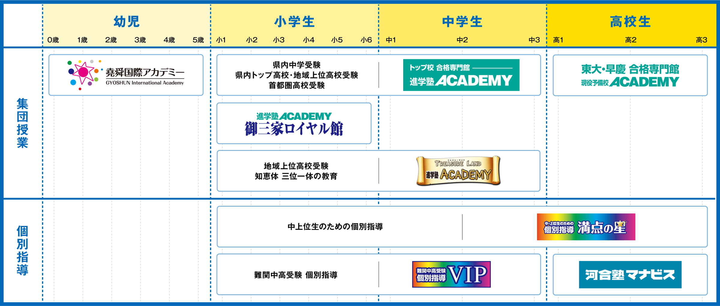 0歳からの英才教育、トップ校合格を目指す高校・大学受験までの一貫教育の提供とお子様の目的別に選べる受講形式