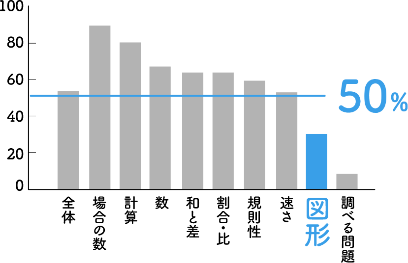 図形の問題を解く上で必要なのは、公式を覚えこむことではありません。 脳の柔らかい小学生の間に図形のなりたちをイメージする力、すなわち「イメージングカ」をきたえることが必要です。 また、中学入試では、多くのお子さまが苦手とする「図形分野」=「正答率の低い問題」を得点することで、合格力を高めることができます。