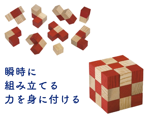 制限時間内にいくつかのピースを組み合わせ、立方体や直方体、見取り図で示された立体を作るゲーム。 手・目・脳を使い、空間認識力、想像性、集中力、立体的な構成力が磨かれます。