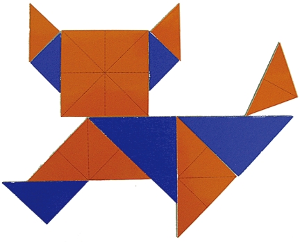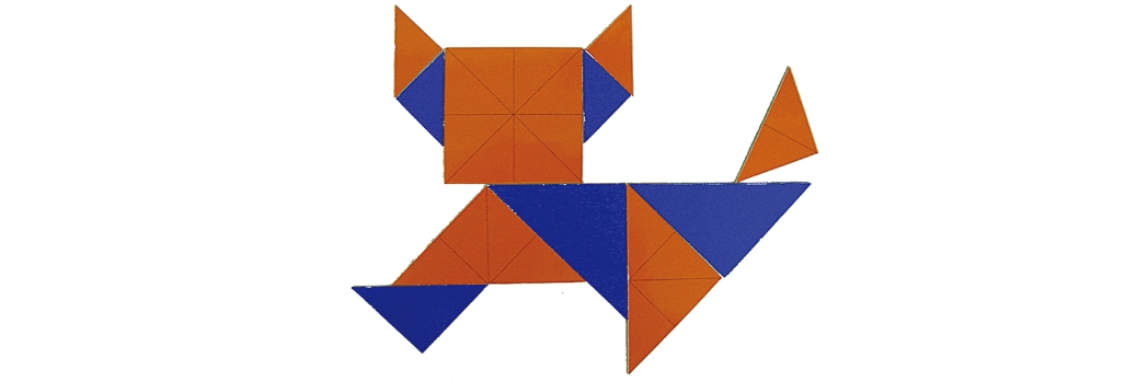 3種類の大きさの直角二等辺三角形10枚と正方形1枚。合計11枚 のピースすべてを使って、 影絵と同じ形に並べます。 平面図形のセンス、構成、再現、イメージする力を磨きます。