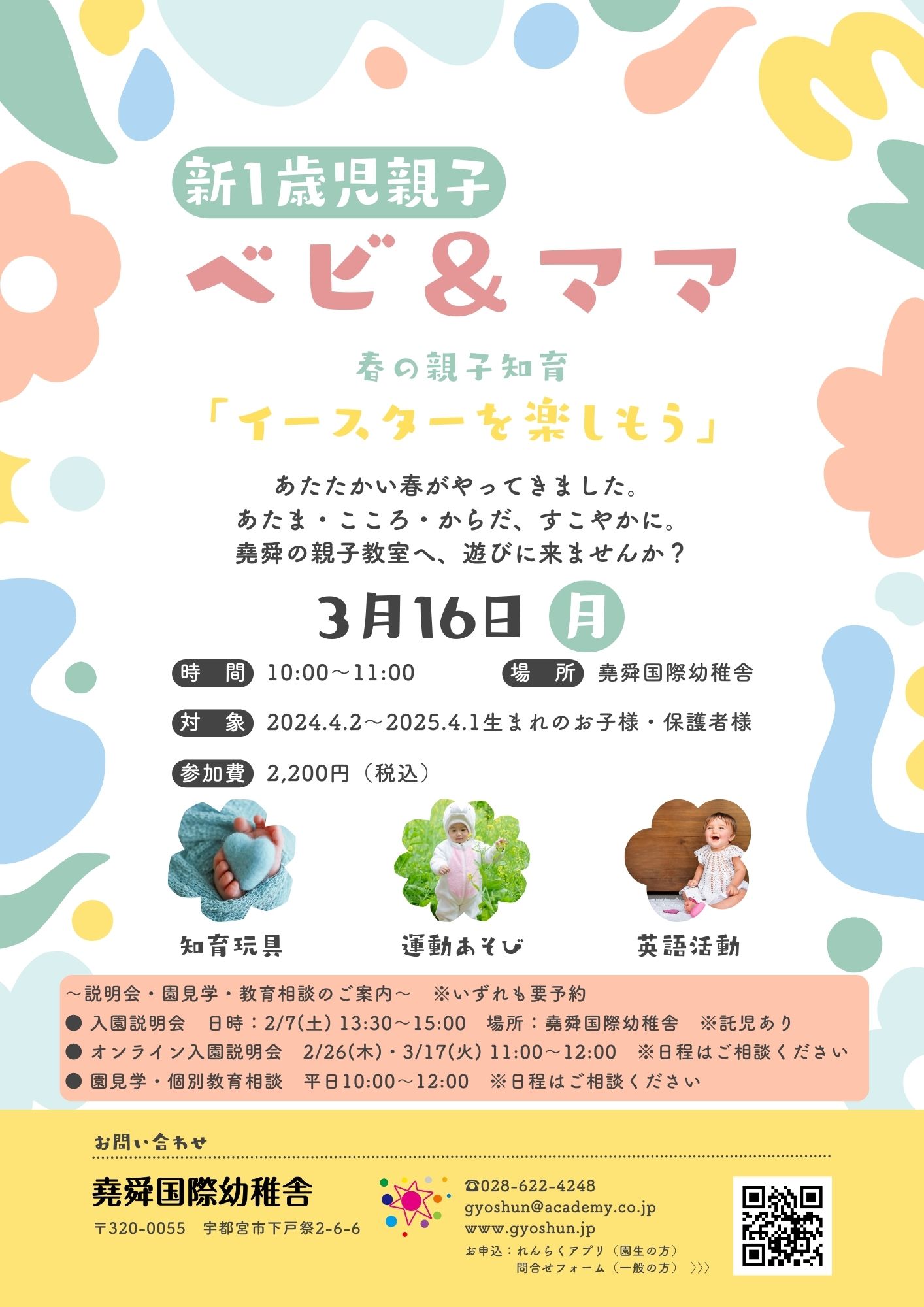この度は堯舜にご興味をお持ちいただき、誠にありがとうございます。知育活動を体験してみたいという方には「ベビ&ママ 春の親子知育」を、「堯舜の教育をもっと知りたい」という方には「入園説明会(オンラインあり)・園見学」を、ご用意しております。皆様のご参加をお待ちしております。
