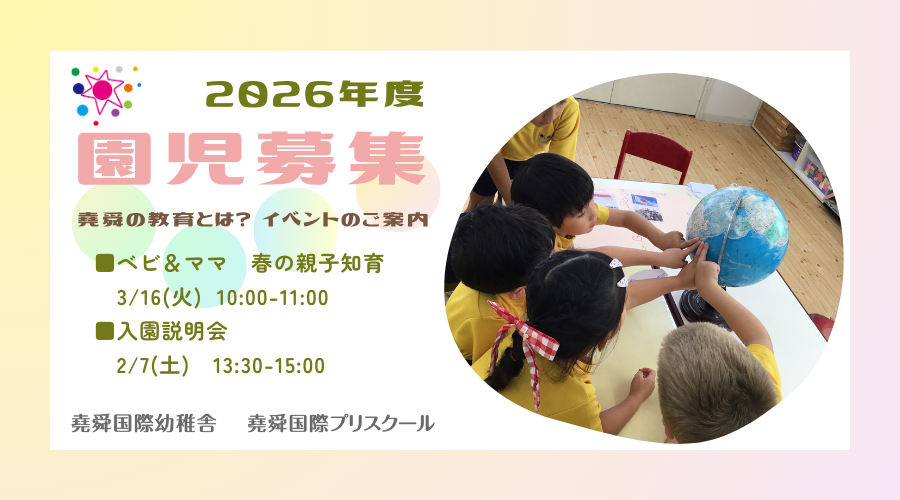 この度は堯舜にご興味をお持ちいただき、誠にありがとうございます。知育活動を体験してみたいという方には「ベビ&ママ 春の親子知育」を、「堯舜の教育をもっと知りたい」という方には「入園説明会(オンラインあり)・園見学」を、ご用意しております。皆様のご参加をお待ちしております。
