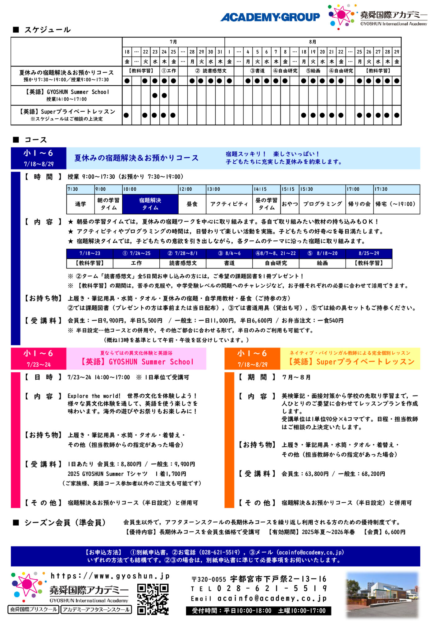 【小1~6】アカデミー・アフタヌーンスクール 夏休みコース 堯舜国際アカデミー 基礎学力(小学生向け) 小1〜小6 「夏休みの宿題解決&お預かりコース」は、毎日の学習+楽しい活動が毎年大人気! 宿題スッキリ、充実した夏休みを約束。また、「GYOSHUN Summer School」では、夏ならではの異文化体験と英語浴が楽しめます! 申込フォームはこちら