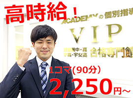 - 個別指導VIP教室は、「レベルの高い中学校や高校に行きたい」「学校の成績をとことん上げたい」と希望されて生徒さんに多く通塾ただいてます。生徒さんの成績を徹底的に上げるため、授業を全て「1対1」で行っています。