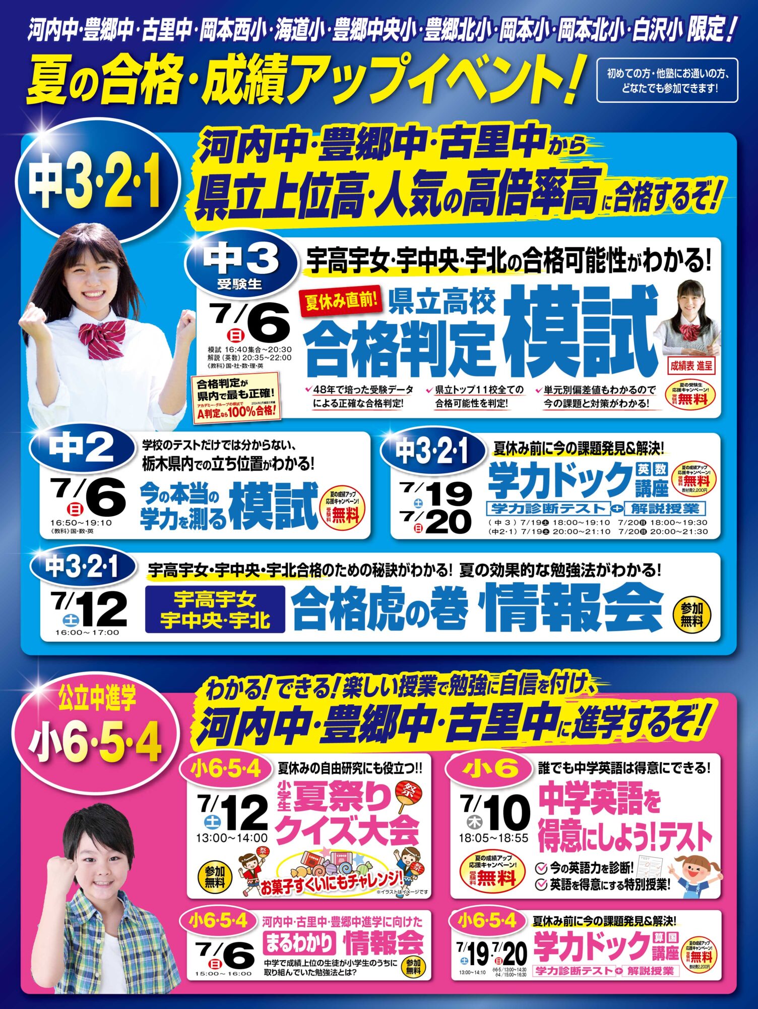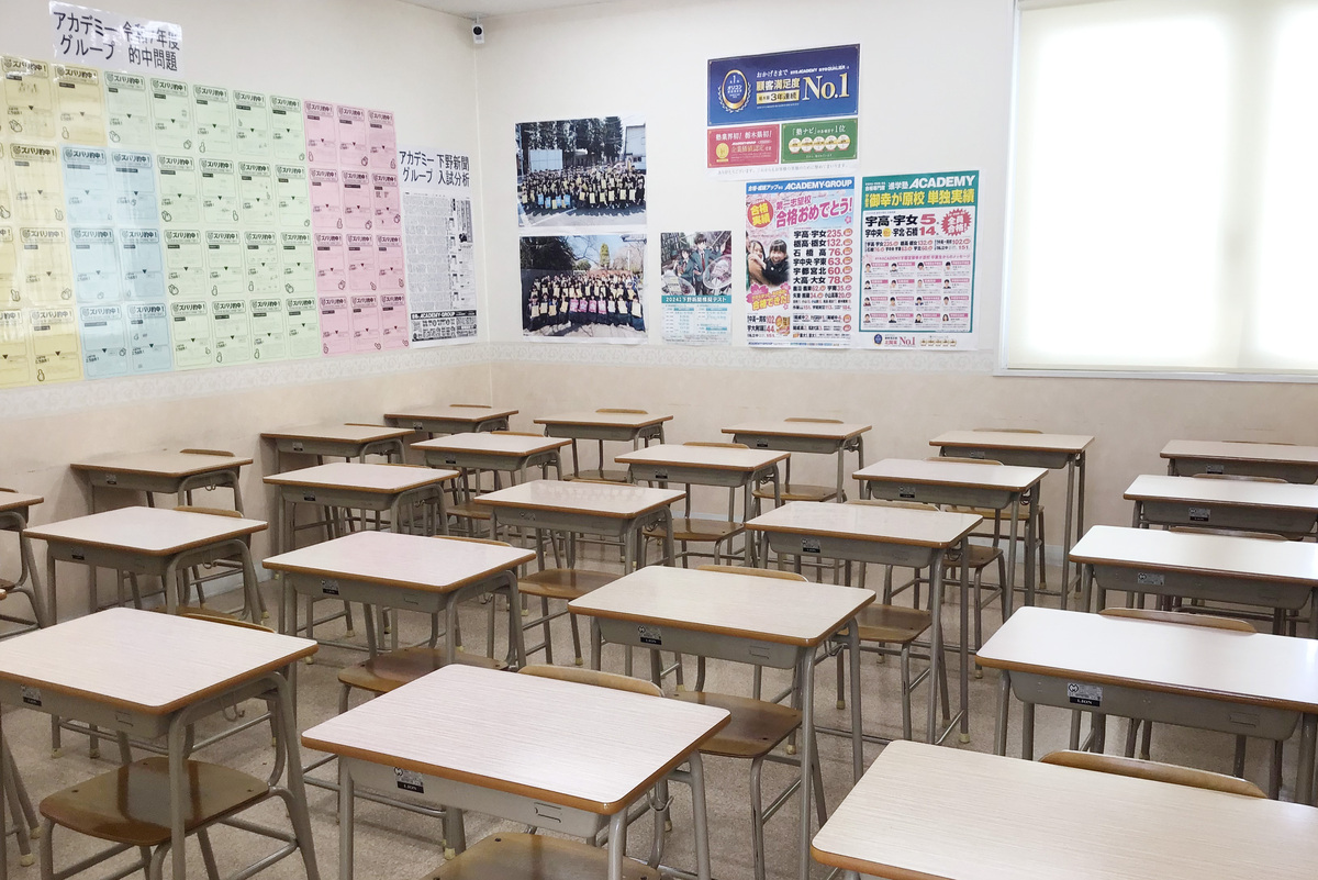 また、河内中・古里中・豊郷中のエリアから宇高・宇女の県立最上位高校、宇中央・宇北・石橋などの高倍率高校の合格を目指すお子様が多く通っています。小学生は将来、河内中・古里中・豊郷中など地元公立中学校へ好成績で進学を目指す小学生にお通い頂いています。また、アカデミー・グループの近隣校舎と連携して宇東附中・県内私立中合格指導も行っています。