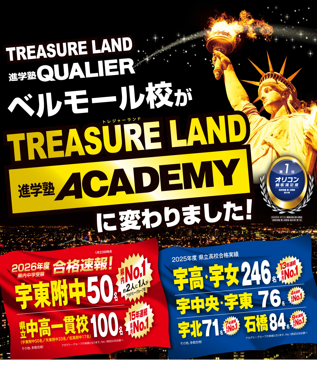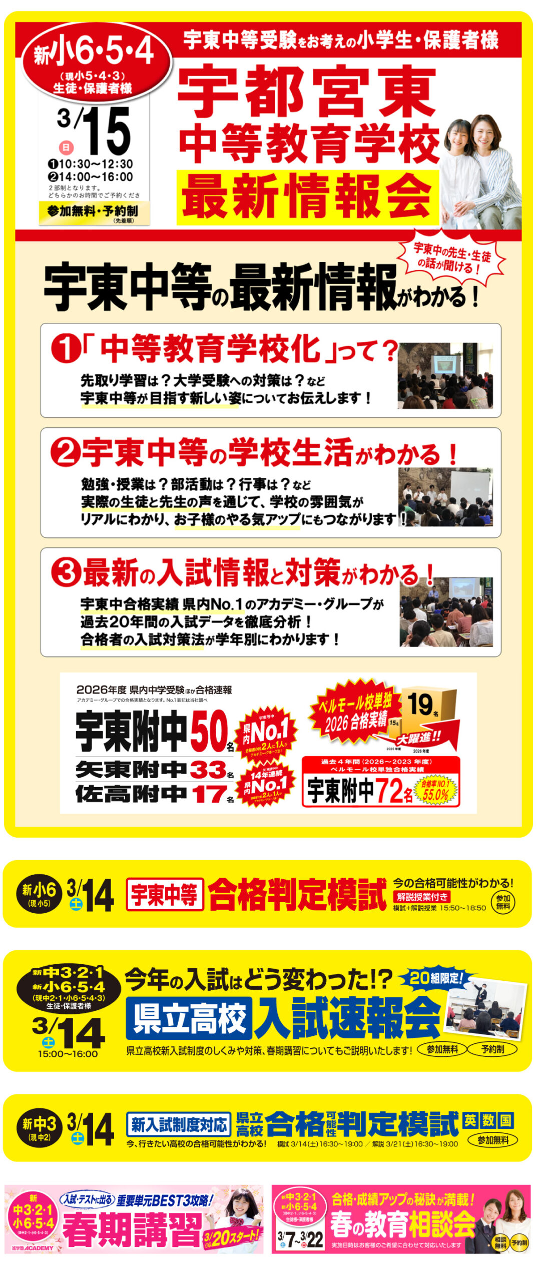 高校受験においても、宇高・宇女・宇東・石橋・宇中央など県立上位校・人気の高倍率校へ毎年多くの合格者を輩出しています。さらに、陽東中・宇東附中・泉ヶ丘中・鬼怒中など定期テスト対策を徹底し学年トップ10、学年上位生を毎回輩出しています。また、中学受験を行わない小学生に向けては、開校から10年間大人気の「河内式ミラクル英語コース」「勝ち組の算数」などで地元公立中へ上位進学を目指しています。小学生低学年(小1~3生)からの知能教育にも力を入れており、「玉井式国語的算数」「玉井式図形の極」で早くからの思考力向上を目指しています。
