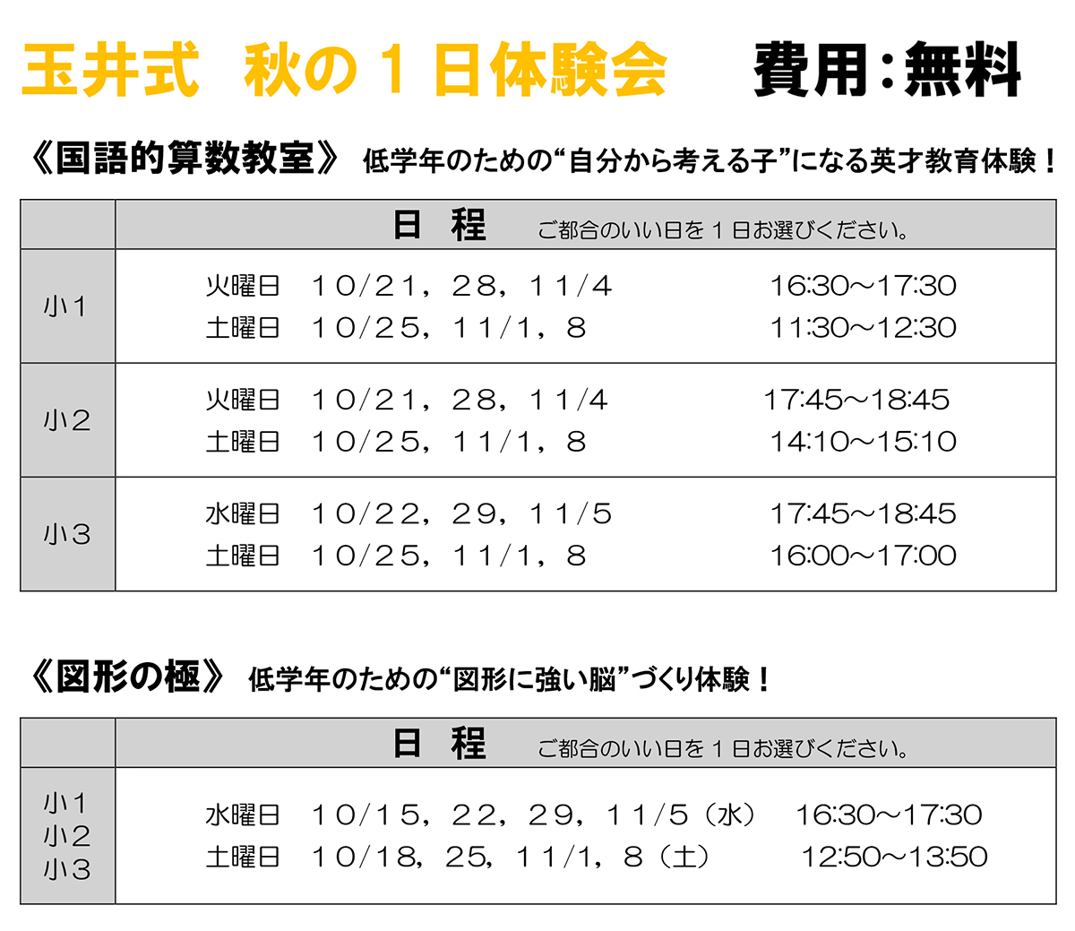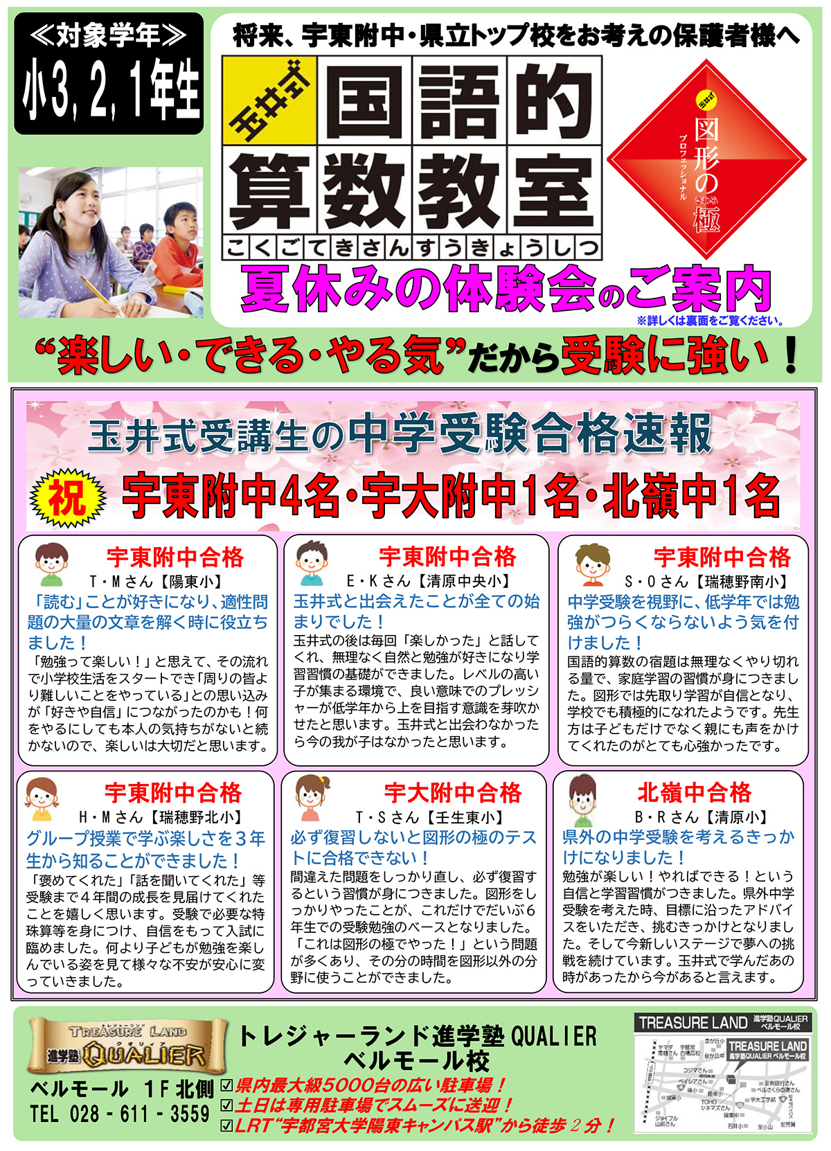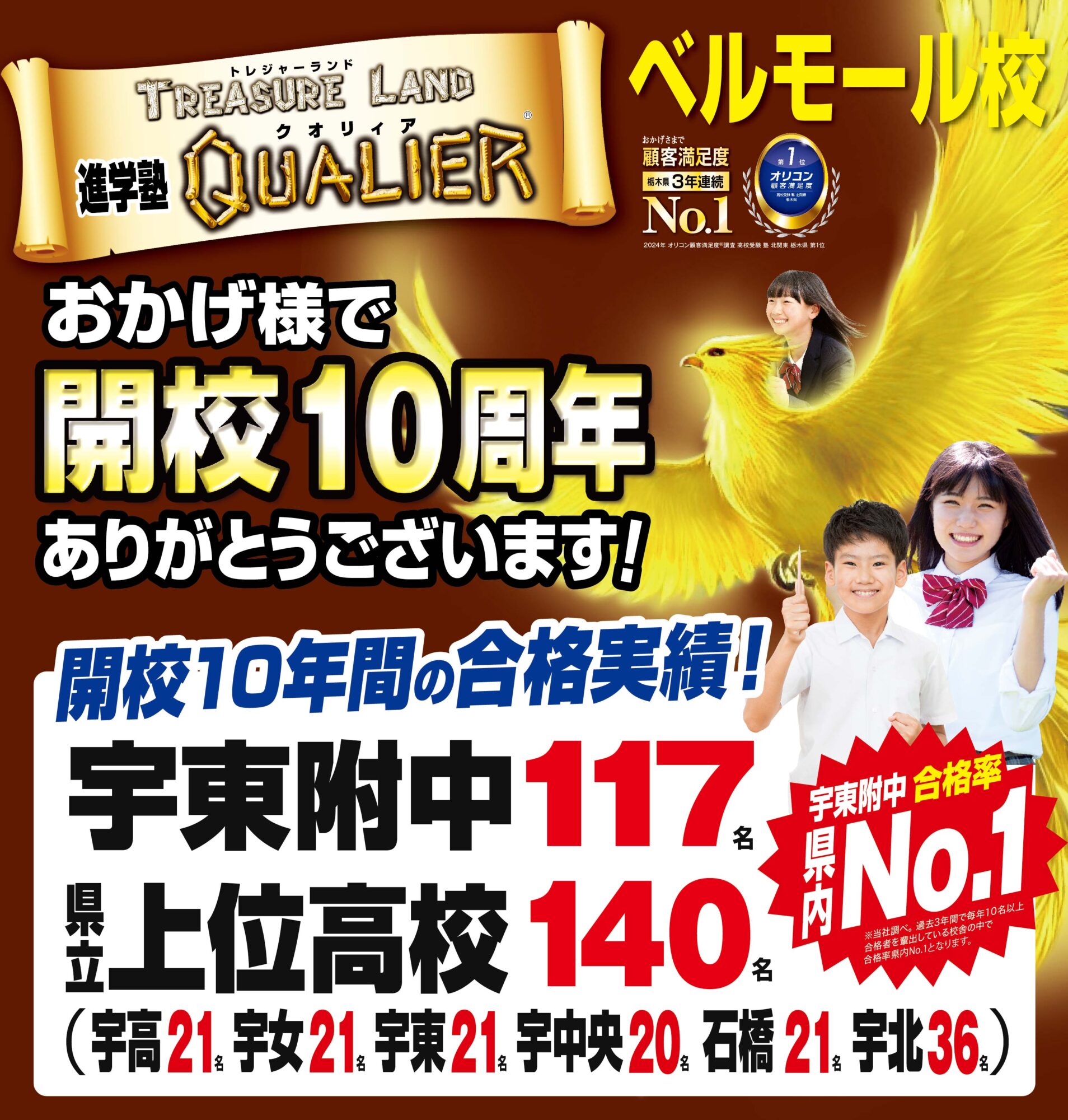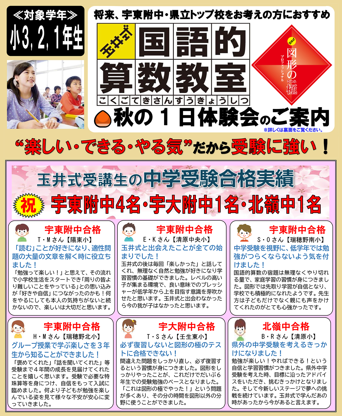 高校受験においても、宇高・宇女・宇東・石橋・宇中央など県立上位校・人気の高倍率校へ毎年多くの合格者を輩出しています。さらに、陽東中・宇東附中・泉ヶ丘中・鬼怒中など定期テスト対策を徹底し学年トップ10、学年上位生を毎回輩出しています。また、中学受験を行わない小学生に向けては、開校から10年間大人気の「河内式ミラクル英語コース」「勝ち組の算数」などで地元公立中へ上位進学を目指しています。小学生低学年(小1~3生)からの知能教育にも力を入れており、「玉井式国語的算数」「玉井式図形の極」で早くからの思考力向上を目指しています。