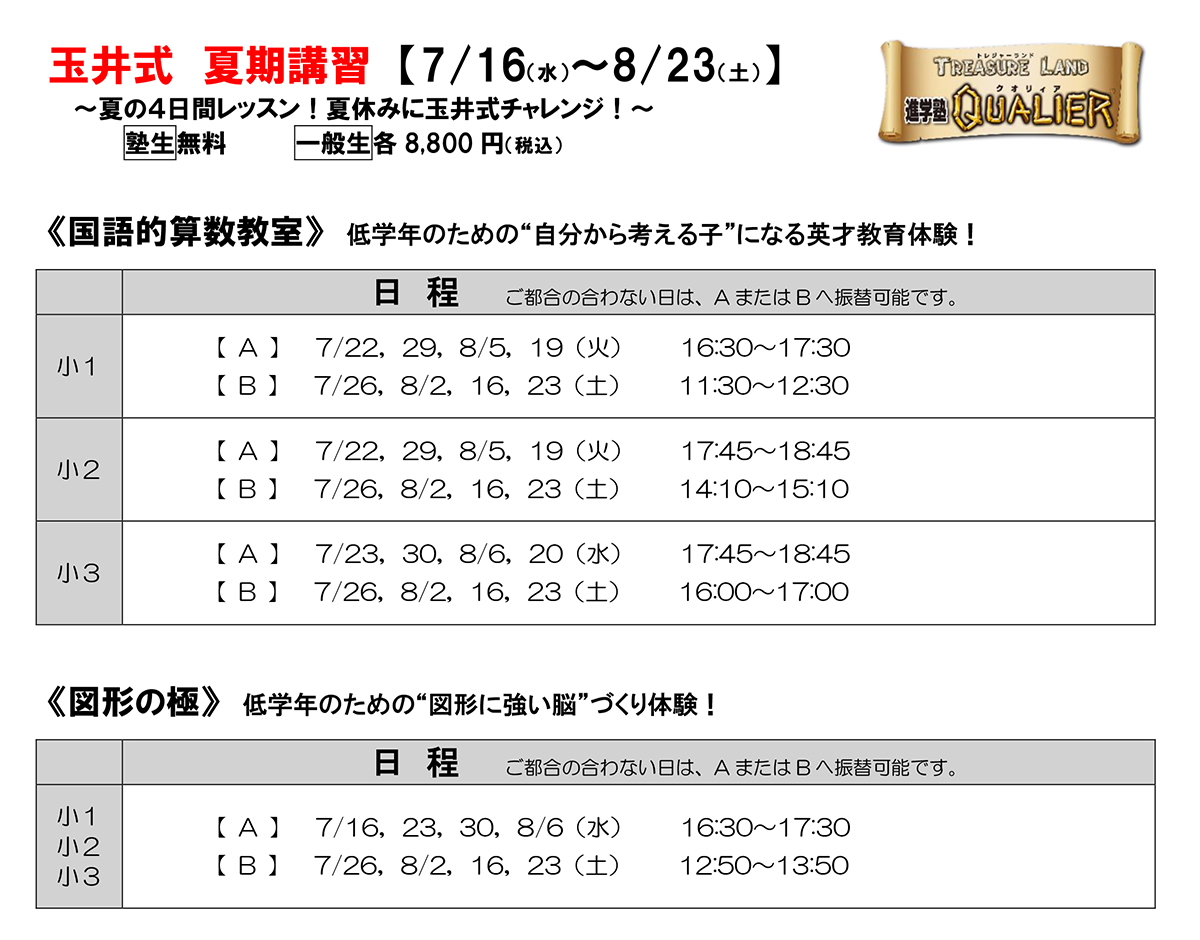 トレジャーランド進学塾QUALIERは、自分が持っている「宝物」を発見し、その「宝物」を磨き、将来社会で出て活躍できる人財輩出を目指す新しいカタチの進学塾です。これまで将来の夢を叶えるための「夢宝地図セミナー」など他にはない取り組みを行っています。