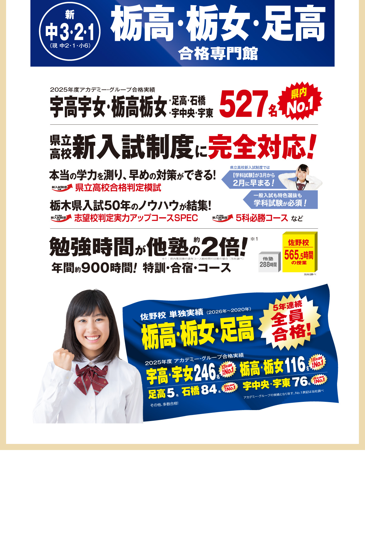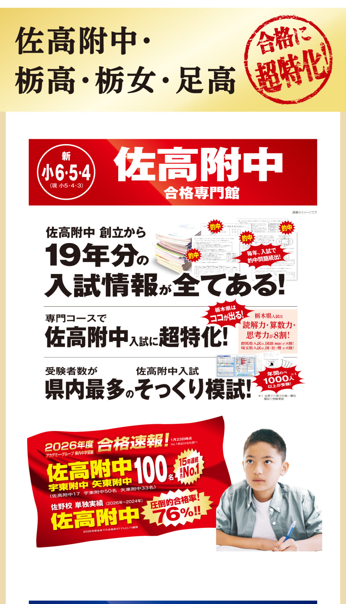 佐高附中を志望される方には、適性検査の解法や作文の書き方・面接等で合格できる十分な力を指導いたします。公立中学校に進学される方には、中学進学後に上位の成績を維持できるように、高い知識を身に付けます。また、高校入試では、「栃高栃女高足高合格専門館」として、過去5年間で全員合格という合格実績を出しています。
