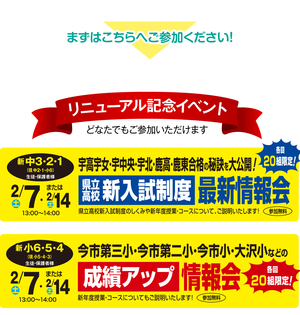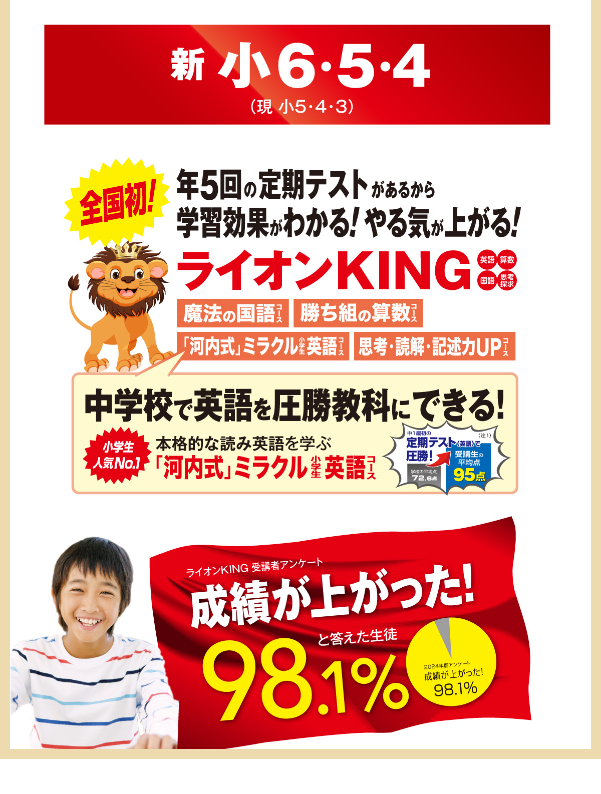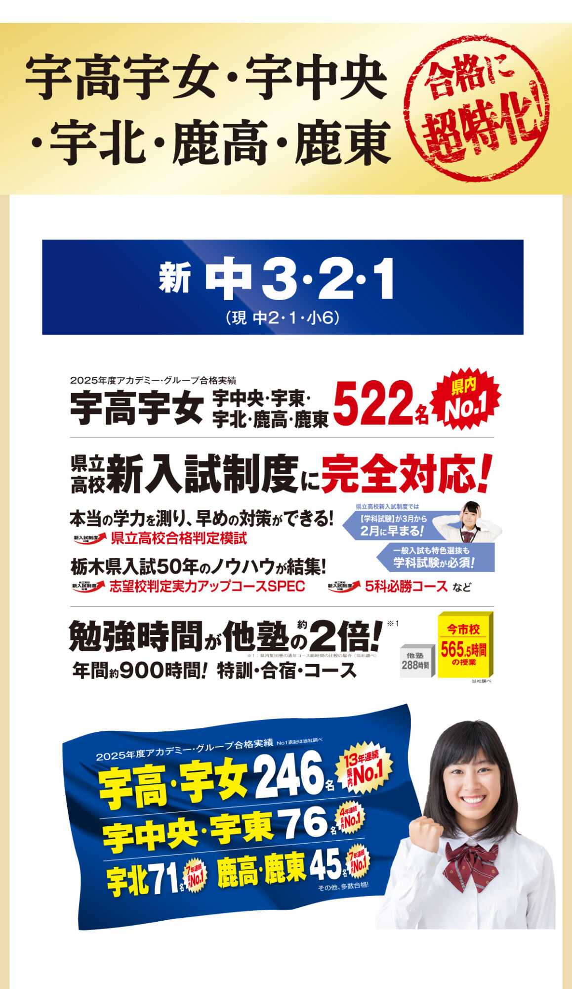 楽しく厳しく勉強と向き合うことでお子様の学力が向上し、徳育を通して人としての成長をすることができ、その上で宇高宇女・栃高栃女・鹿高鹿東など県内中上位高校合格を目指す塾です。県内中上位高を狙っているお子様に選ばれる理由は、学力向上と人間性の成長を兼ね備え、地域で一番の成果と情報量もポイントです!また、小学生のうちから将来県立中上位高校を目指せるようライオンKINGコース(算国コース)や誰でも中学校の英語を得意にできる河内式ミラクル英語コースでお子様のやる気を引き出し、高い基礎学力の定着を目指しています。