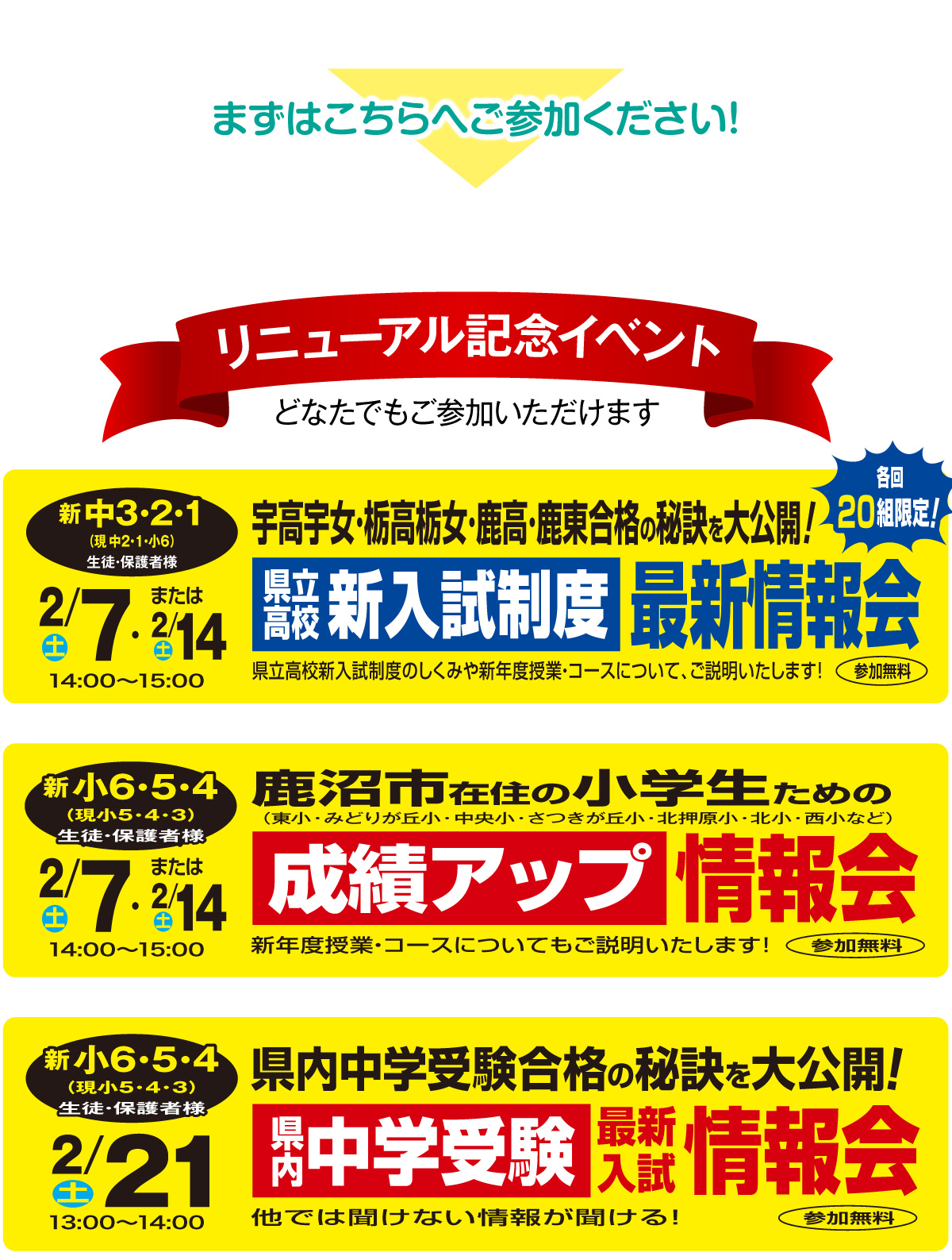 鹿沼高校を中心に、宇高宇女、栃高栃女などの県内上位校に対しての対策も、49年間の栃木県入試研究の成果を活かした指導力で、日々指導しております。去年は「宇高宇女・栃高栃女全員合格」を成し遂げました。小学生に向けては、国語、算数はもちろん、中学校で苦手になりやすい英語にも力を入れております。
