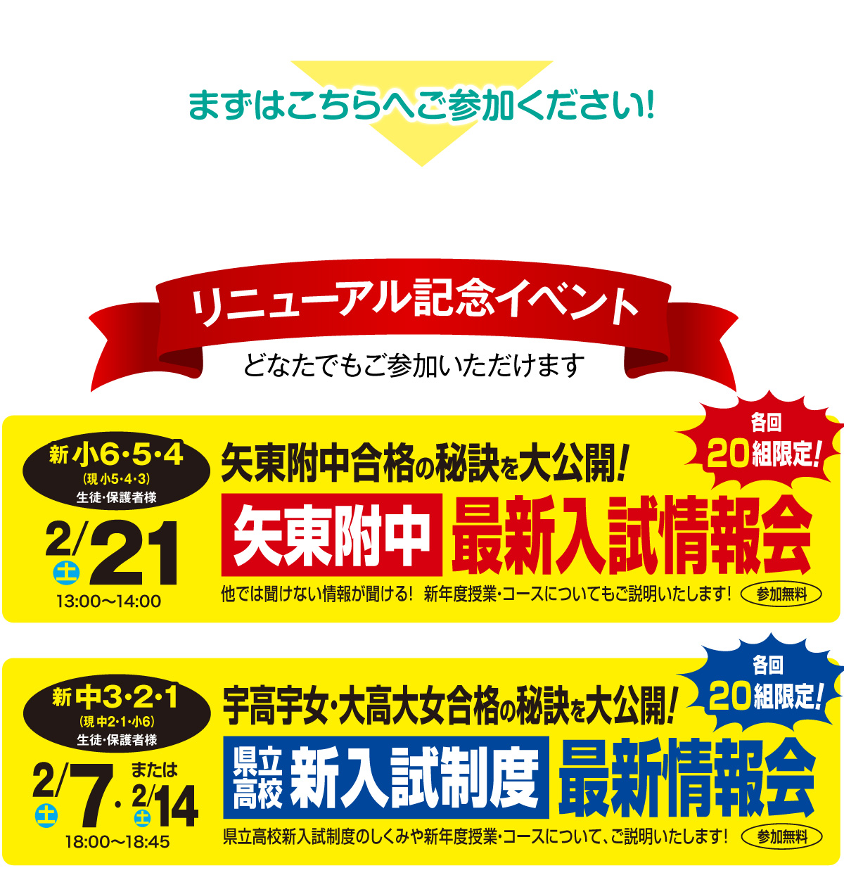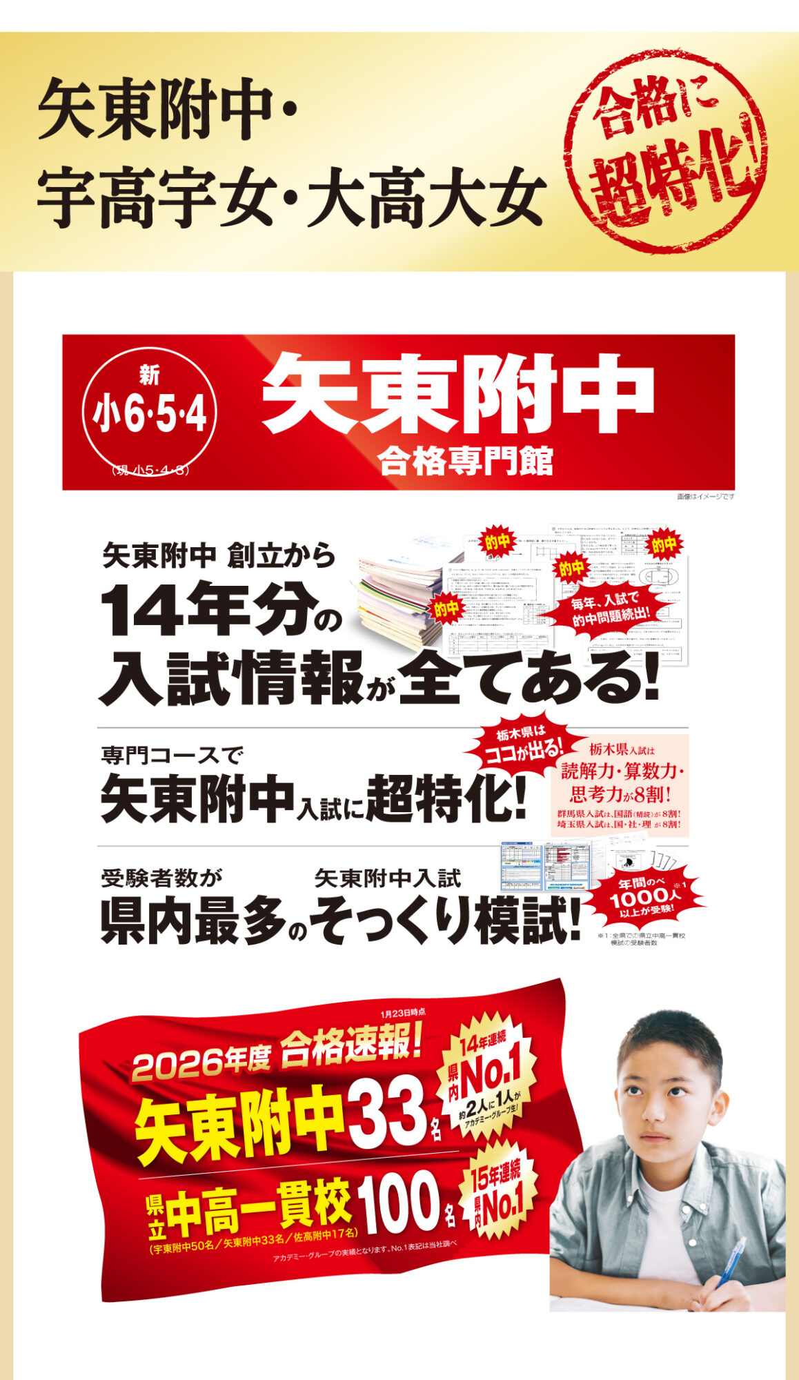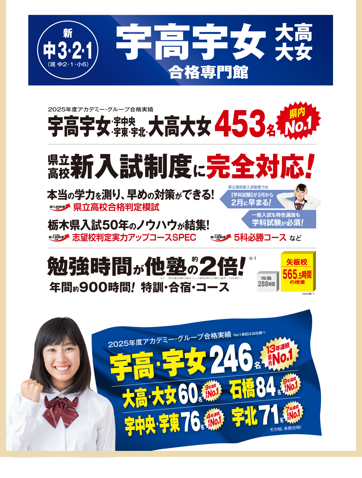 宇高宇女・宇中央宇北・大高大女矢東の合格者数は過去3か年で48名、矢東附中合格者数は過去3か年で33名と,地域唯一の合格専門館として毎年No.1の合格実績を輩出しております。