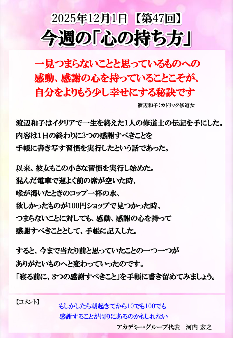 【第47回】一見つまらないことと思っているものへの 感動、感謝の心を持っていることこそが、 自分をよりもう少し幸せにする秘訣です